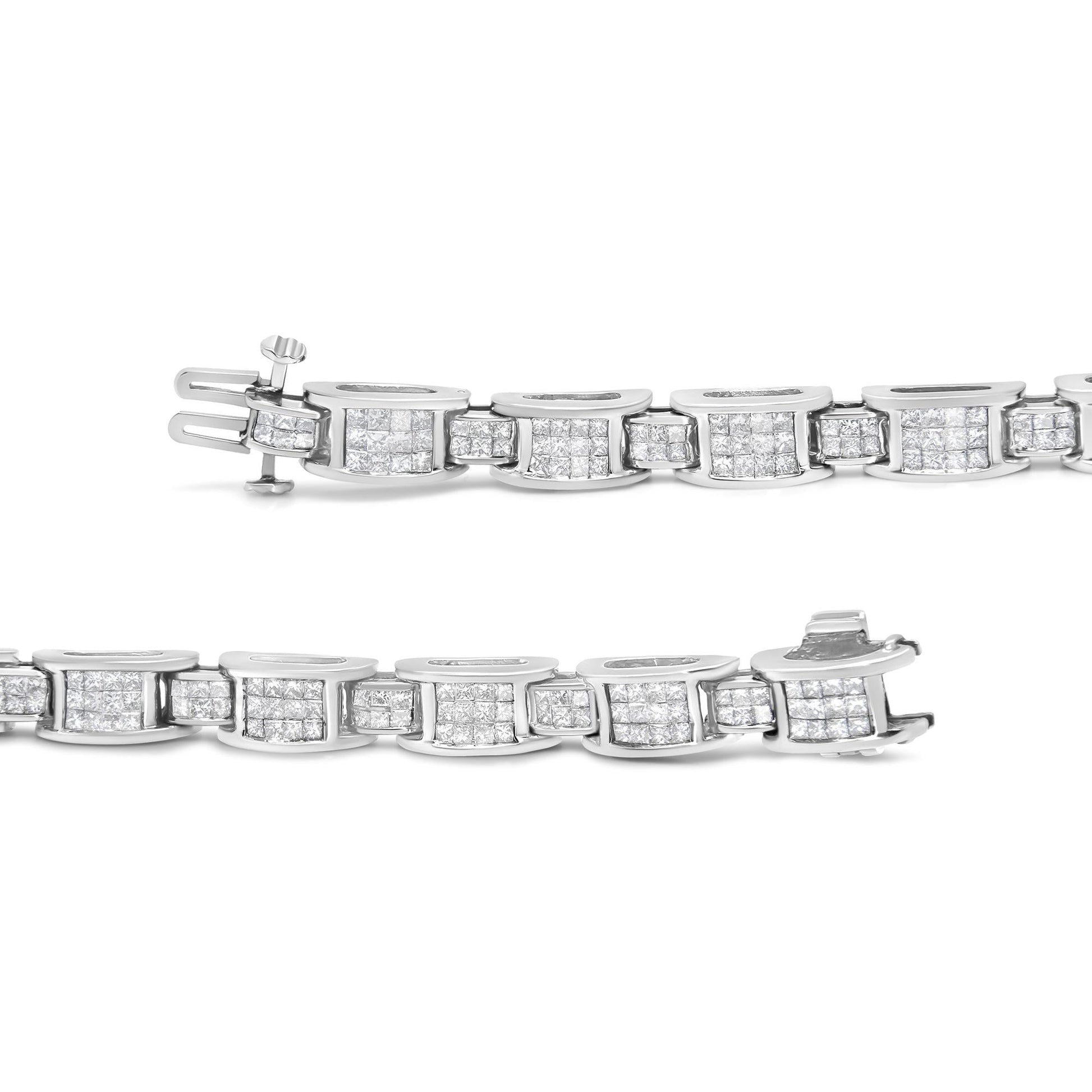 A must have for any serious jewelry collection, this stunning 14K white gold tennis bracelet boasts an impressive 5.0 carat total weight of diamonds. The bracelet features D or bridge shaped links that alternate between large and small sizes both inset with invisible set grids of square, princess cut white diamonds. Each diamond studded link is connected by hinges. Elegant and timeless, this gorgeous 7” tennis bracelet fastens securely with a box with tongue and safety clasp. This classic, bold bracelet makes a great gift for any special occasion! Whether worn for daytime glamour or evening sparkle, this bracelet is gorgeously versatile. Give her a gift that will perfectly complement her favorite ensemble.