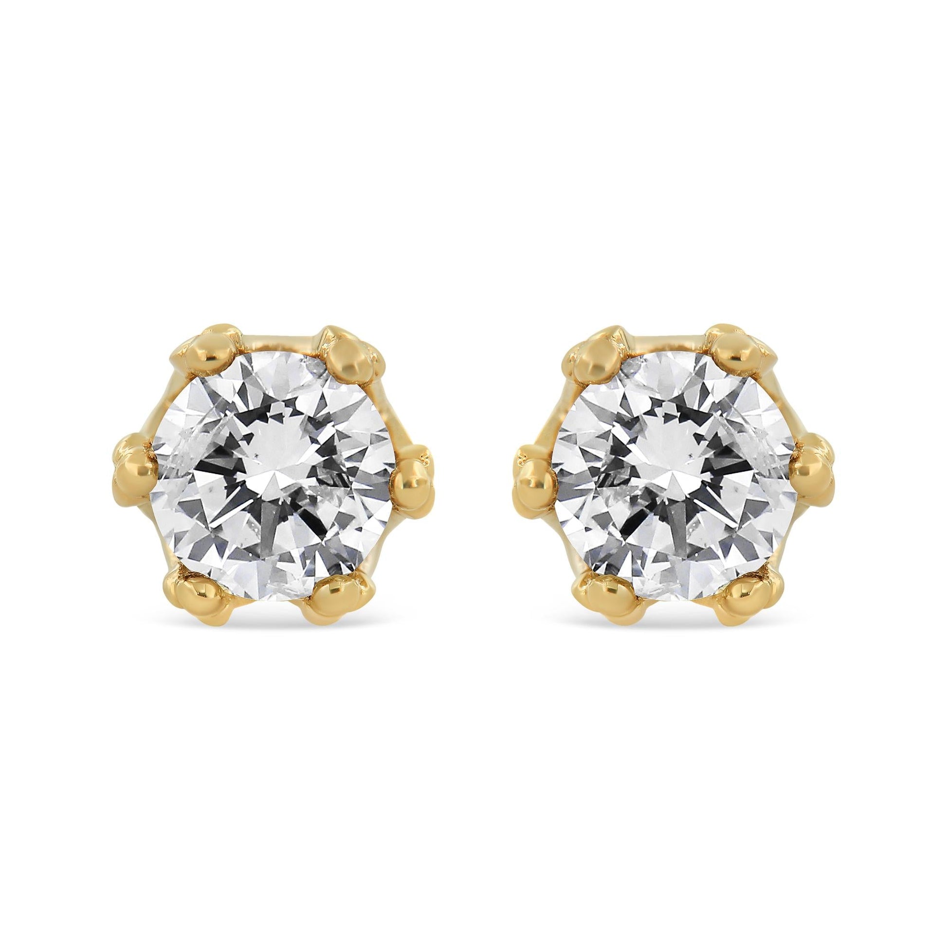 With regal hidden details, these diamond stud earrings are anything but ordinary. From the front, these 14kt yellow gold studs look like solitaires with a multi-prong setting. But the sideview brings into focus the crown design. Round diamond accents stud the base of the crown and the points hold the front-facing round diamond in place. These earrings include 2.0 cttw of natural diamonds and they have posts with screw backs for comfortable secure wear. These elegant gold and diamond crown studs will make the perfect addition to to your jewelry collection.